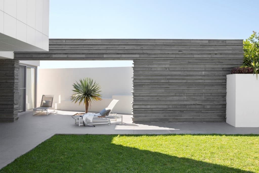 La terrasse en bois qui prolonge le salon, le banc sous le…