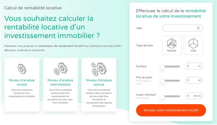 Si vous veulent simplement estimer la rentabilité de votre projet d’investissement immobilier, les ingénieurs de l’agence Flatlooker , leader dans la gestion de la location en ligne, ont développé un simulateur de rentabilité locative totalement gratuit et particulièrement fiable.