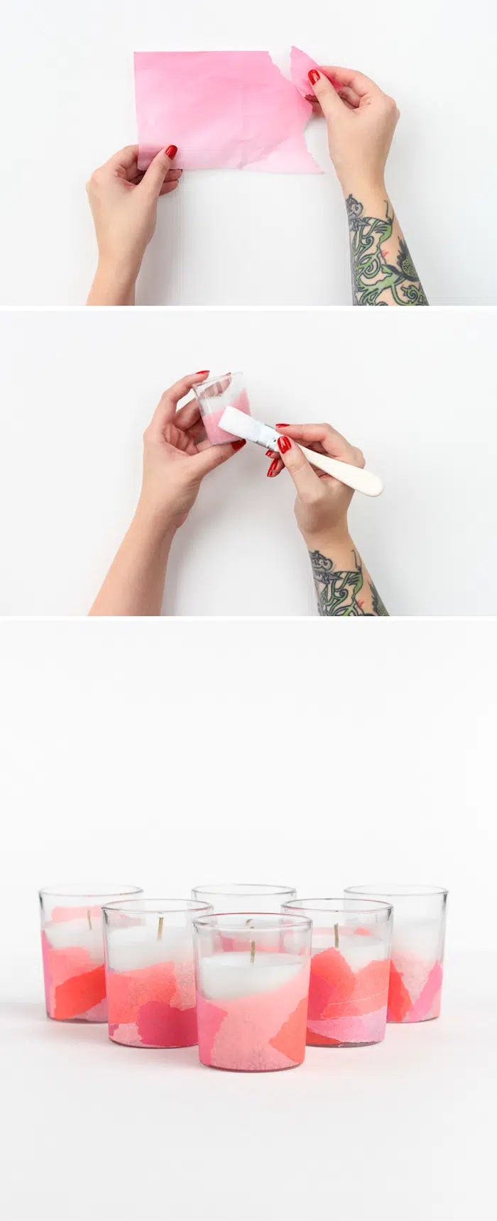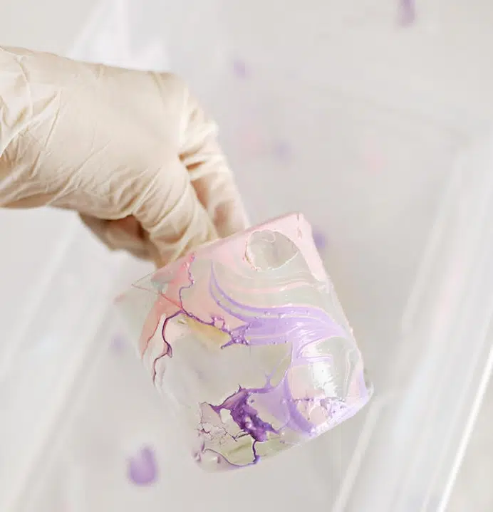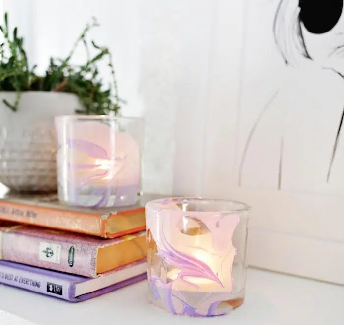 Ensuite, vous pouvez déjà tremper le pot en verre dans l’émulsion. Tournez le pot sur lui-même pour colorer sa surface avec de jolies formes marbrées. Enfin, retirez-le de l’eau et laissez-le sécher sur un morceau de papier paraffiné. Afin de protéger la surface, appliquez une couche de vernis dessus. Ici, mettez une bougie dans le bocal en verre et entourez-vous d’une atmosphère romantique.