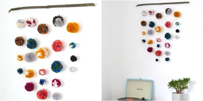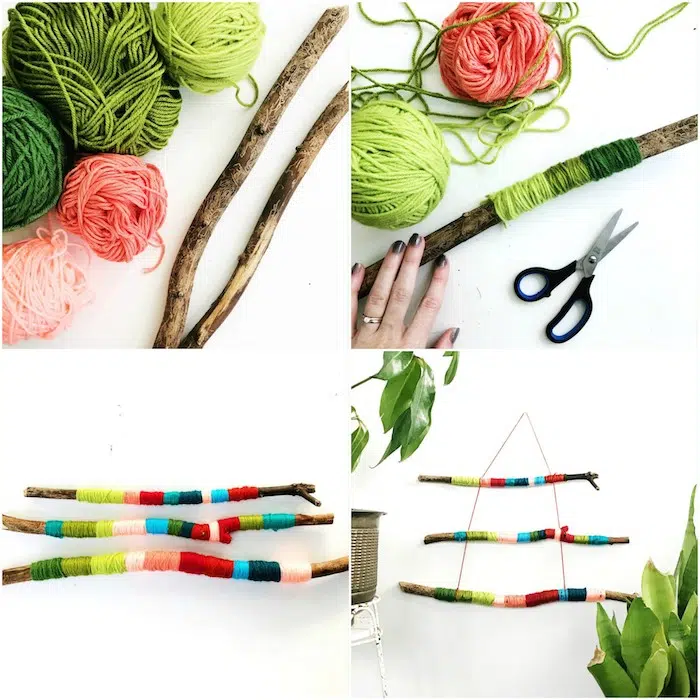 Bois flotté orné de laine colorée pour créer une belle décoration murale. Exemple d’activité manuelle pour les adultes pendant de longues journées d’hiver