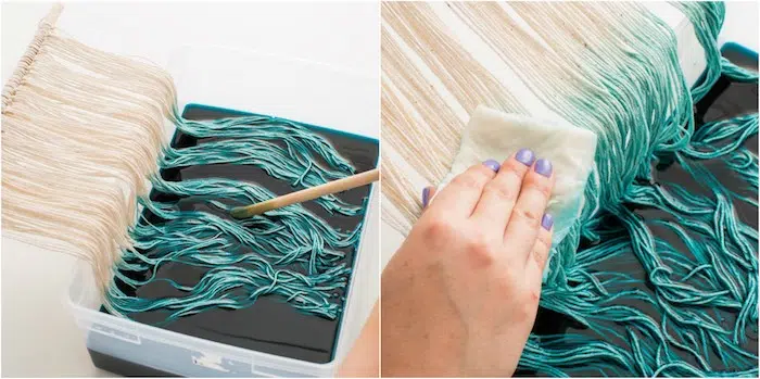 Ensuite, retirez la frange de cordes du bol rempli d’eau, égouttez bien et placez la partie humide dans le récipient contenant le colorant. Pour créer un effet ombragé, retirez immédiatement les quelques centimètres du haut de la partie colorée et séchez avec une serviette en papier. Enfin, laissez reposer le reste reposer pendant une heure dans le colorant (ou le temps de coloration indiqué sur l’étiquette du colorant utilisé). Retirez, laissez sécher et composez votre décoration. Dans le boîtier en béton, nous avons placé la pièce de macramé non colorée au-dessus de celle que nous avons teintée. Comme vous le verrez ci-dessous, cela crée un effet assez intéressant.
