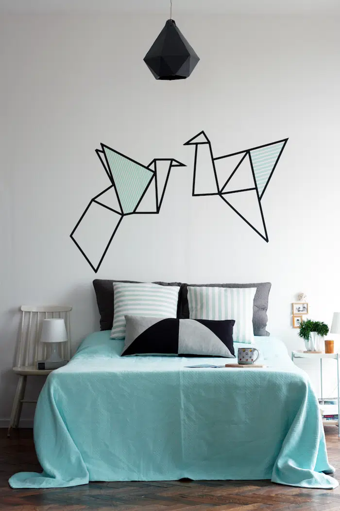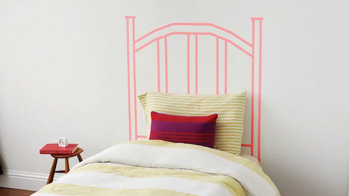 Vous voulez faire une tête de lit sans avoir à aller dans de trop gros métiers. Le ruban Washi est une excellente solution décorative. Obtenez des ciseaux et des couleurs de ruban de masquage et des motifs que vous aimez et décorer l’espace derrière le lit avec des motifs intéressants. Vous pouvez créer une belle trompette l’œil, en assemblant quatre bandes de ruban washi dans un rectangle, imitant la tête de lit traditionnelle. Ou pourquoi ne pas aller plus loin en créant de beaux motifs géométriques ou des motifs inspirés d’un sujet très concret.