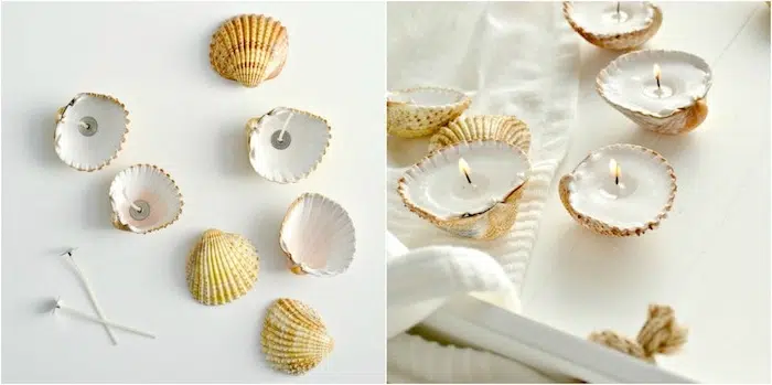 Chambre idée déco avec coquillages de mer, transformés en petites bougies. Une excellente idée pour un décor de bord de mer dans la chambre