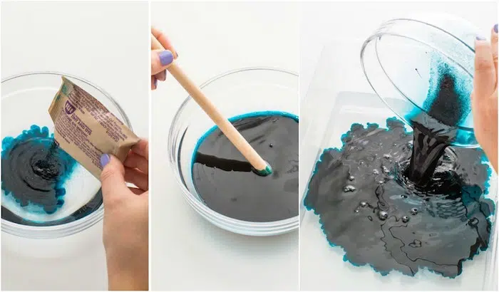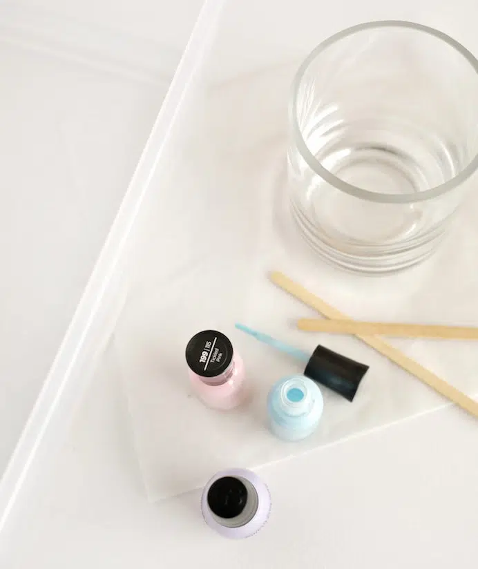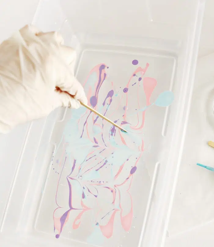 Ensuite, mettez quelques gouttes de vernis à ongles de chacune des couleurs que vous avez choisies, en vous assurant d’effectuer ce processus le plus rapidement possible. Après, avant que le vernis à ongles sèche, prenez la pointe en bois et commencez à remuer afin de disperser les couleurs. Continuez jusqu’à ce que vous soyez marbré modèles que vous aimez.
