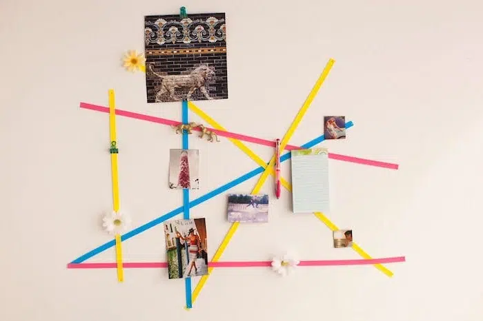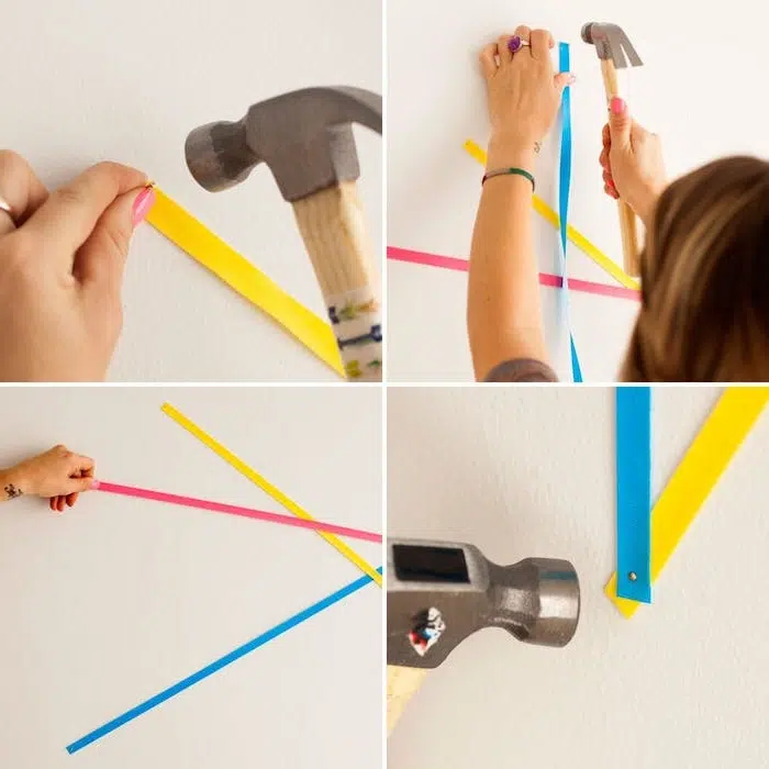 Tableau de bord constitué de bandes de ruban croisées et fixé sur un mur. Manuel adulte
