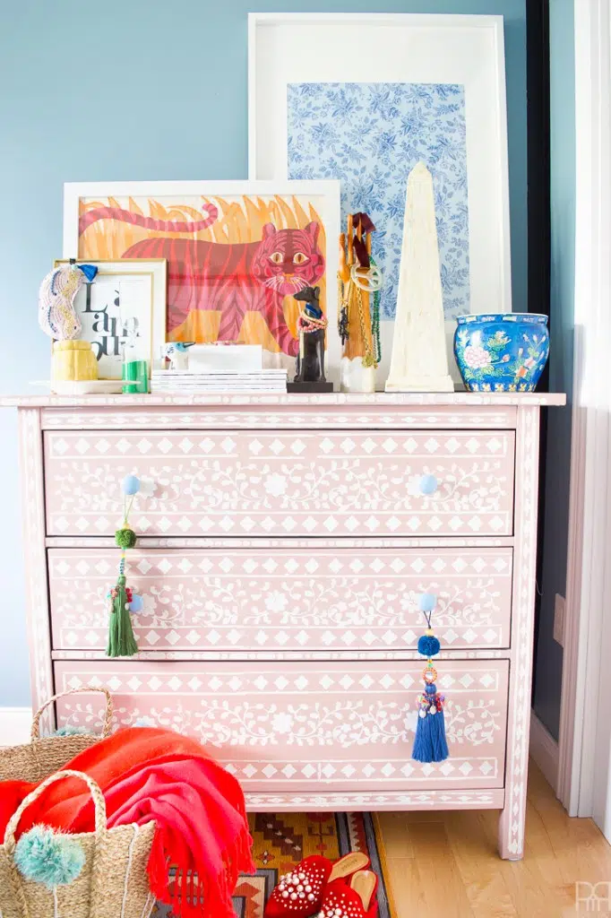 Peinture et pochoir ou auto-adhésif autocollants pour reregarder un mobilier de chambre à coucher. Voici encore une idée de bricolage de pièce facile. Trouvez d’excellentes idées de projet plus loin dans cet