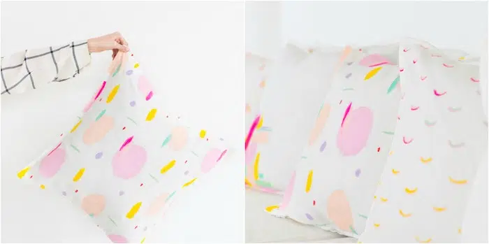 Encore une grande idée de tutoriel pour créer une décoration colorée. Idée de design décoratif — taies d’oreiller personnalisées avec une touche de peinture textile