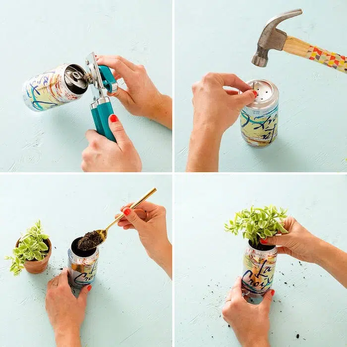 Une boîte de boisson transformée en pot de fleurs. Un adolescent de bricolage pour les amoureux des tendances récupère