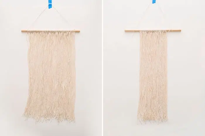 Ensuite, utilisez autant de fils que possible pour décorer la première baguette, celle qui est la plus longue (une centaine de ficelles suffiront). Chaque ficelle doit être pliée en deux, puis attachée sous elle sur le bâton. C’est un travail qui demande beaucoup de patience, mais vous verrez que le résultat final en vaut la peine. Nous vous laissons le choix de la longueur de la frange.
