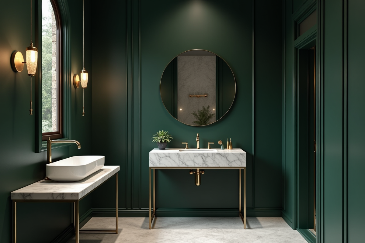 À l’inverse, les grandes salles de bains peuvent se permettre des couleurs plus intenses. Le vert et le violet créent un effet enveloppant et chaleureux, tout en apportant une certaine sophistication.