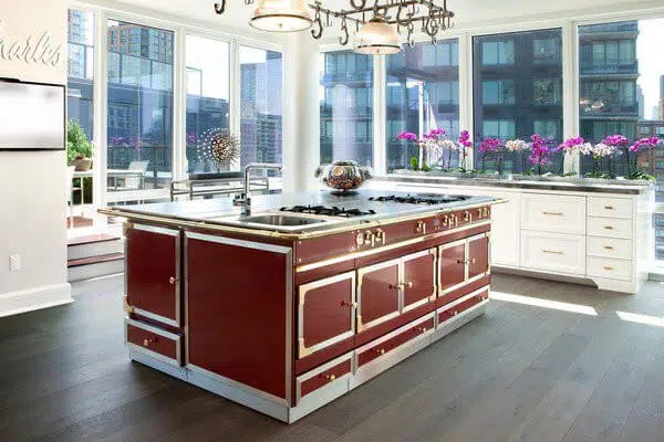 - Le parquet gris combiné avec le rouge crée un espace moderne, avec une touche dramatique.