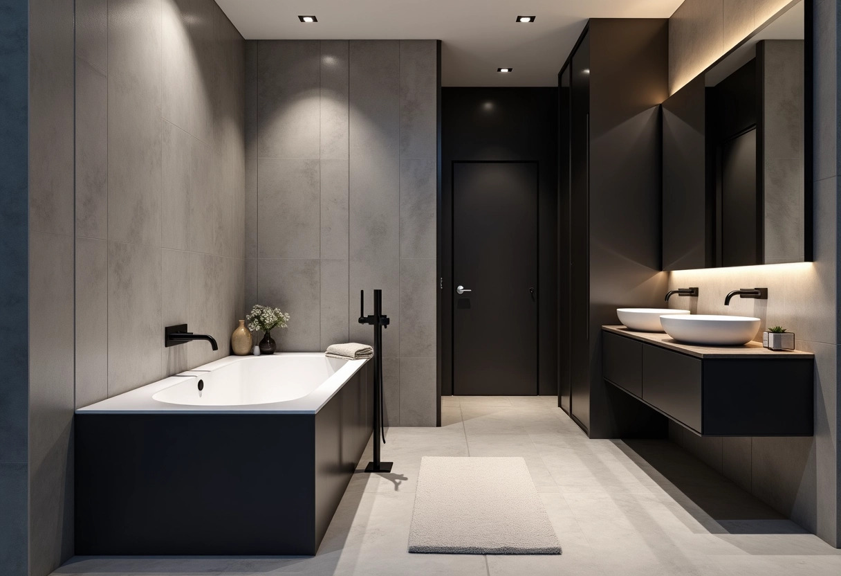 Les douches à l’italienne et les radiateurs design complètent parfaitement la baignoire d’angle, offrant à la fois confort et modernité. Les miroirs et les éclairages bien placés ajoutent une touche finale, rendant l’espace lumineux et accueillant.